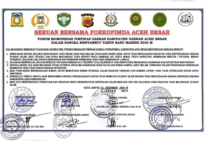 Dalam seruan bersama yang diadakan Minggu (28/12/2025), Bupati Aceh Besar Syech Muharram Idris menyampaikan bahwa masyarakat diminta menghindari semua aktivitas yang berpotensi mengganggu ketenteraman umum. Selain pesta kembang api dan pembakaran petasan atau mercon, larangan juga berlaku untuk meniup terompet, balapan liar, konvoi kendaraan, serta kegiatan lain yang tidak bermanfaat.