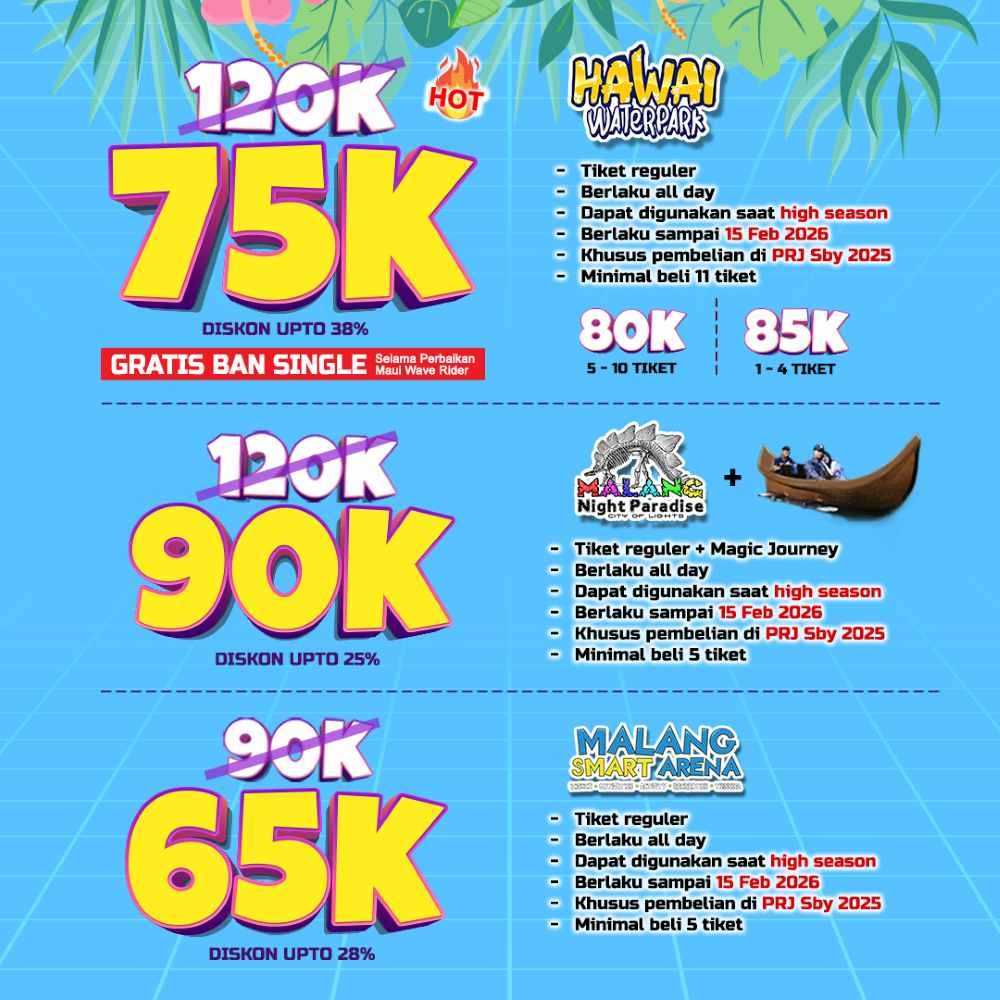 Selain keuntungan harga, pengunjung yang ingin memanfaatkan promo “Diskon Deras” cukup mengunjungi booth resmi Hawai Group di area PRJ Surabaya 2025 dan melakukan pembelian tiket secara langsung di lokasi.