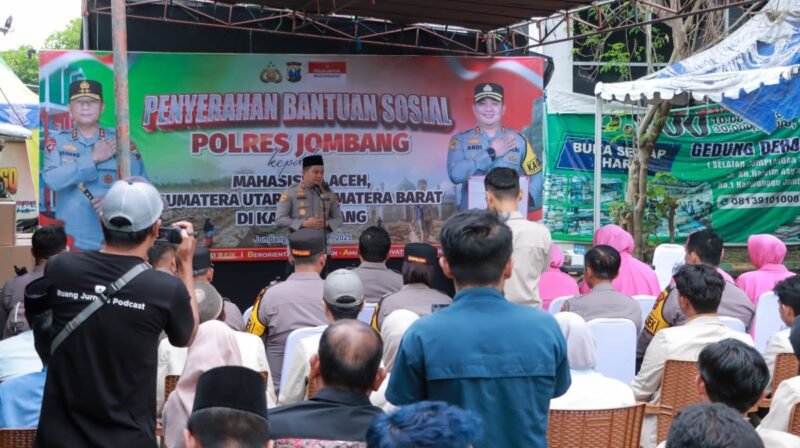 JOMBANG, NGALAMUTAS.COM – Keluarga Besar Polres Jombang telah melaksanakan kegiatan pemberian bantuan sosial (bansos) kepada mahasiswa asal Aceh, Sumatera Utara, dan Sumatera Barat yang menempuh pendidikan di Kabupaten Jombang. Acara berlangsung pada Jumat (19/12/2025) siang, bertempat di Posko Ojol, Jl. KH. Hasyim Asy’ari No. 1, Desa Kaliwungu, Kecamatan Jombang.