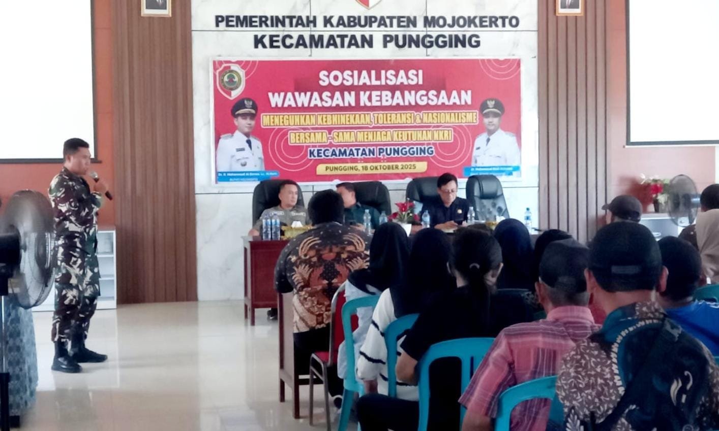 MOJOKERTO, NGALAMUTAS.COM – Guna memperkuat semangat kebangsaan di era globalisasi dan kemajuan teknologi informasi, Kodim 0815/Mojokerto melalui Koramil 0815/11 Pungging berkolaborasi dengan Forum Koordinasi Pimpinan Kecamatan (Forkopimcam) menggelar Sosialisasi Wawasan Kebangsaan (Wasbang) bagi masyarakat Kecamatan Pungging. Acara ini dilaksanakan di ruang pertemuan lantai 3 Kantor Kecamatan Pungging, Desa Tunggalpager, Kabupaten Mojokerto, Jawa Timur, pada Sabtu (18/10/2025).