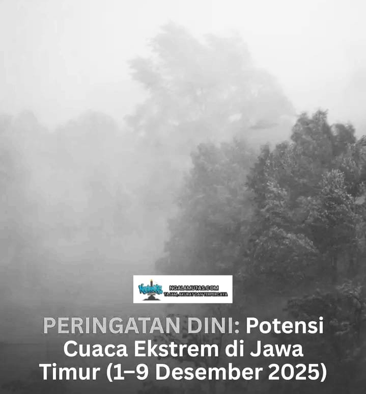 SURABAYA, NGALAMUTAS.COM – 1 Desember 2025, Badan Meteorologi, Klimatologi, dan Geofisika (BMKG) Juanda kembali mengeluarkan peringatan dini terkait potensi cuaca ekstrem yang akan melanda Jawa Timur (Jatim) pada periode 1 hingga 9 Desember 2025. Kondisi atmosfer yang semakin menguat diperkirakan akan memicu berbagai bencana hidrometeorologi di sejumlah wilayah.